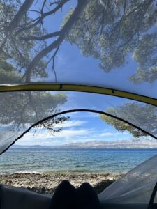 Am Morgen wecken Sie die Zirpen der Zikaden, und der kleine Strand direkt unter dem Zelt bietet den perfekten Start in den Tag.