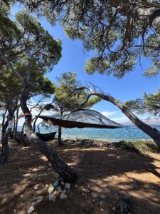 Imagine being a few meters above the ground, in a tent gently swaying in the pine branches, with the scent of the forest around you and the sea in the distance. Our tree tent is a little hideaway for anyone who wants to experience nature from a new perspective – for a day or for a night.